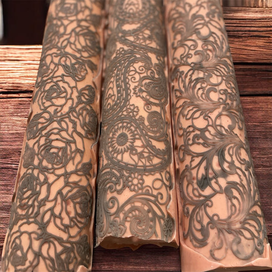 All hand made with lace designs and using beautiful natural ingredients, from infused botanicals, clays, essential oils and milks.