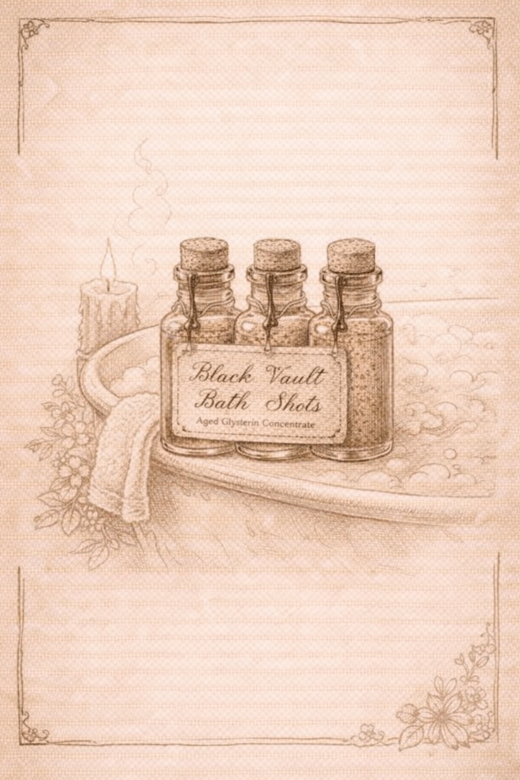 Black Vault Bath Shots are slow-aged glycerin concentrates, steeped over many months and held quietly in the cabinet until they are ready.